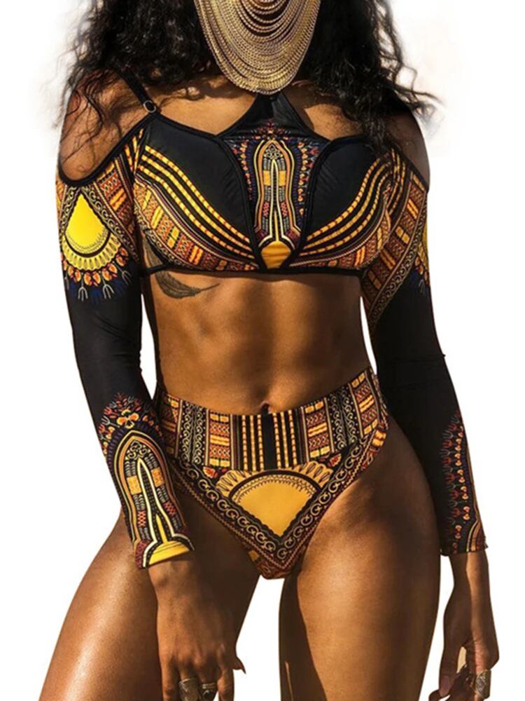 アフリカプリントハイウエストビキニ女性水着長袖水着女性オフショルダー二枚ビキニセット水着水泳 ビキニ セパレート レディース T240618175001_02