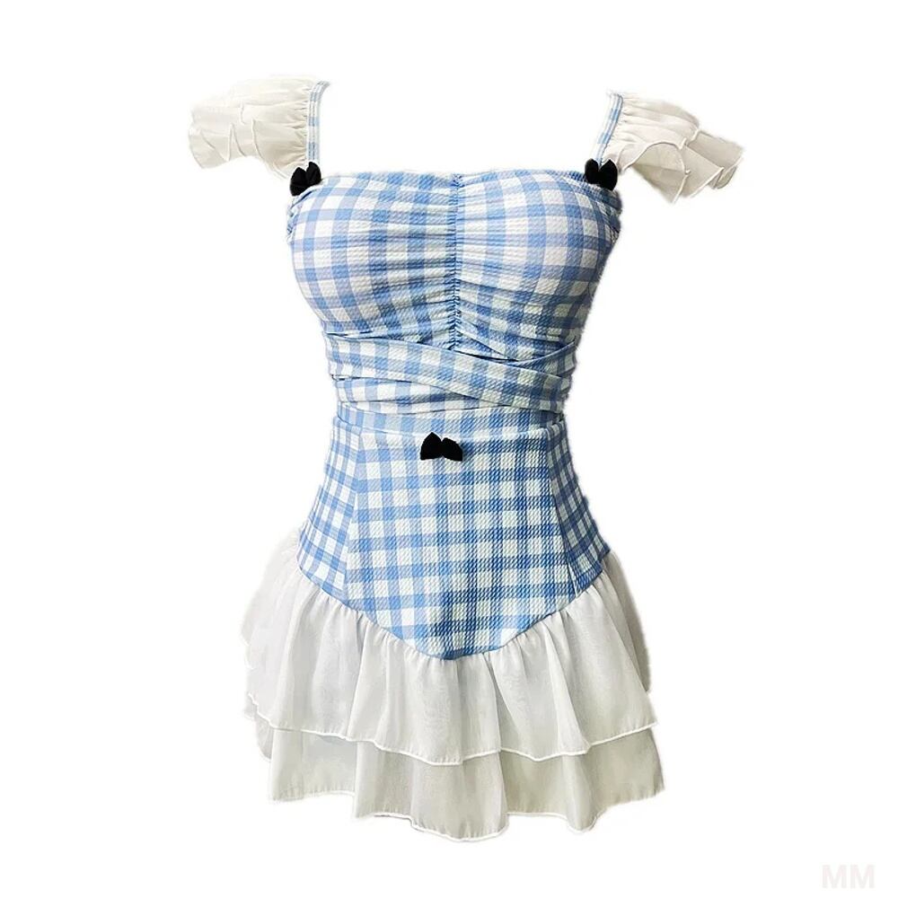 韓国風チェック水着,ワンピース,ビーチウェア,フリルドレス,プールスーツ,冷蔵庫スカート,青と白,夏,2024 韓国系水着 セパレート水着 ワンピース水着 T240626144356_01