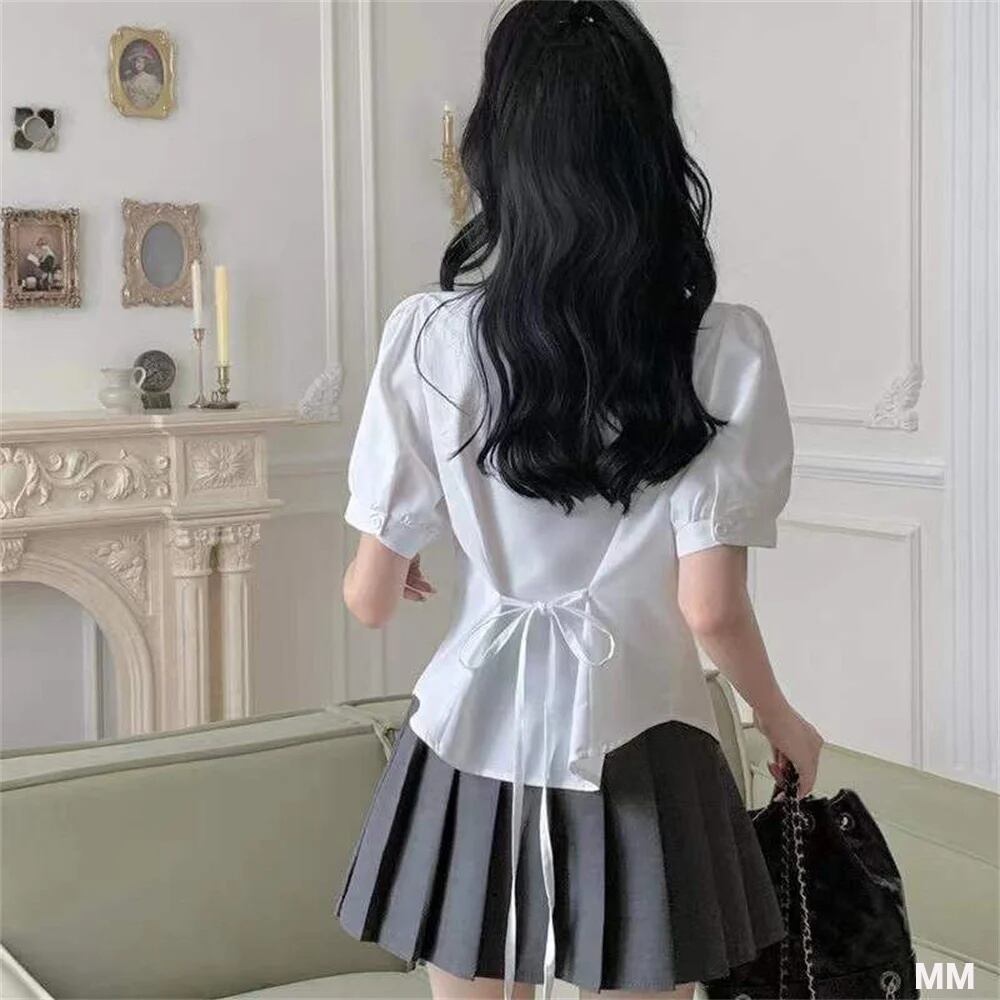 韓国 女性のためのセクシーな半袖プレッピースタイルのTシャツ,ネクタイ付きの薄いトップ,韓国のファッション,新しい春/夏のコレクション2023 Tシャツ シャツ T240619141903_01