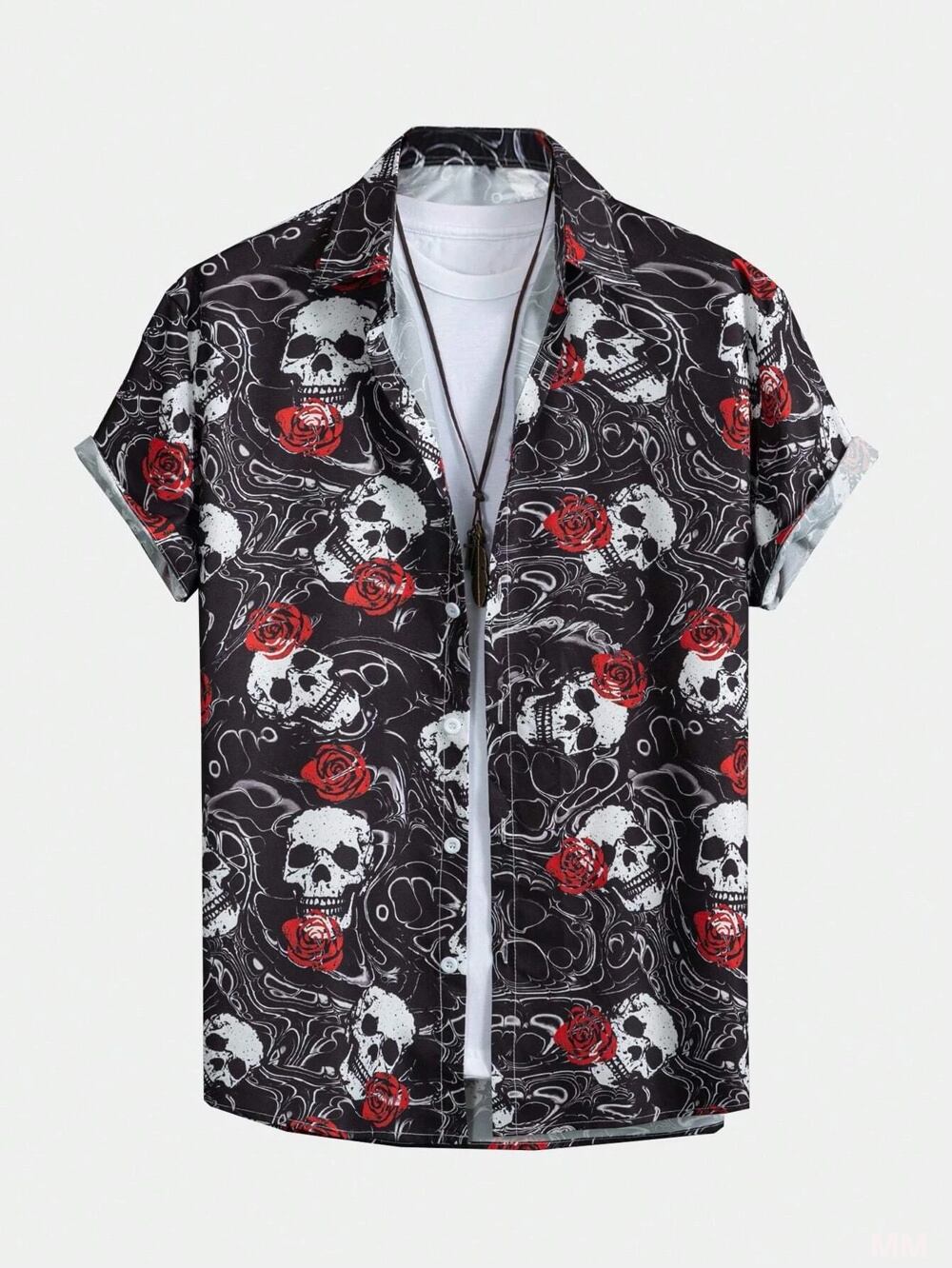 男性と女性の頭蓋骨のパターンのプリントシャツ、半袖シャツ、ボタンのトップス、カジュアルなデザイン、ファッション Tシャツ シャツ T240619141912_02