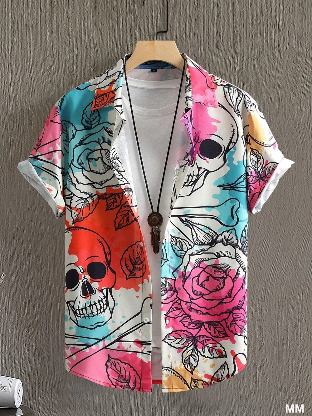 男性と女性の頭蓋骨のパターンのプリントシャツ、半袖シャツ、ボタンのトップス、カジュアルなデザイン、ファッション Tシャツ シャツ T240619141912_03