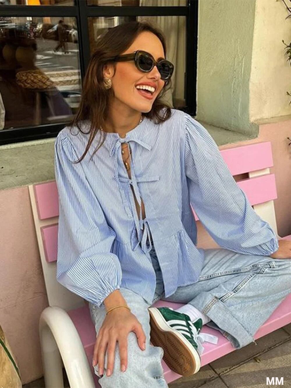 女性用半袖ストライプシャツ、レースアップボーパフスリーブ、ラウンドネックルーズトップス、レディースカジュアルジョーカー服、女性のファッション、夏、2024 Tシャツ シャツ T240619142047_08