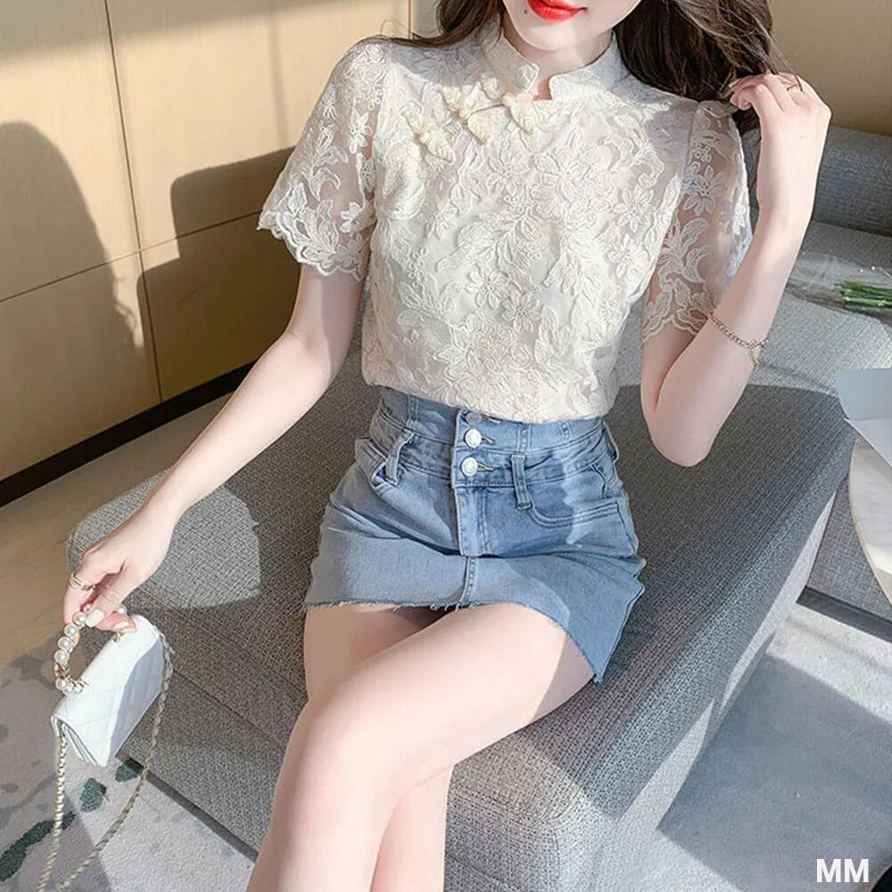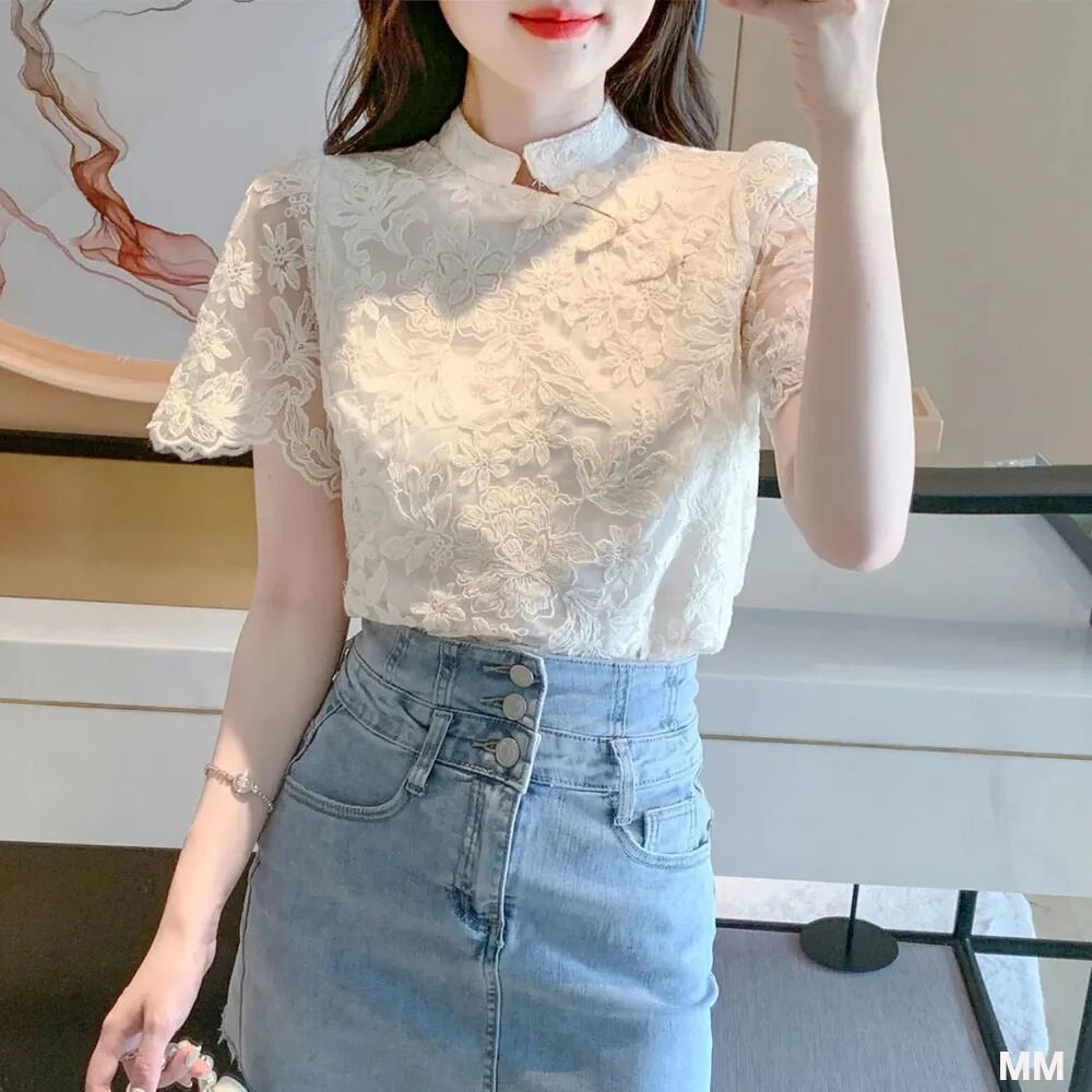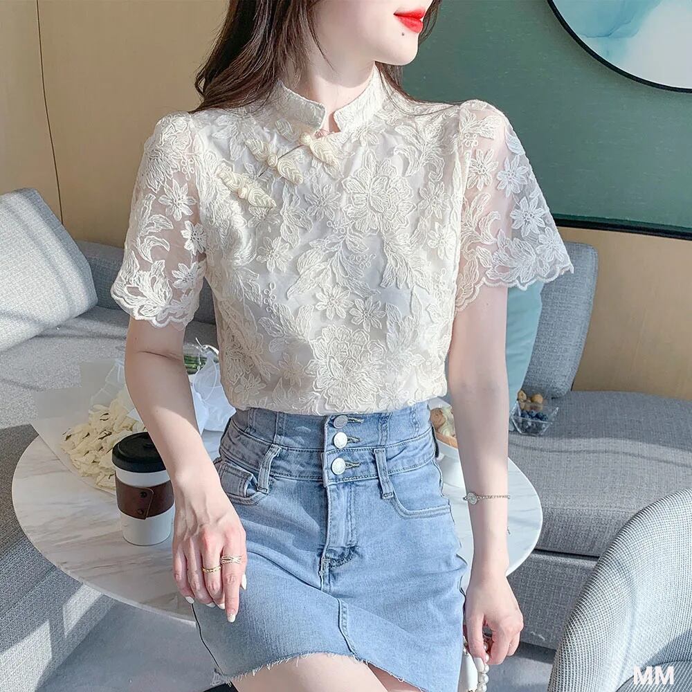 女性用チャイニーズスタイルの半袖ブラウス,レースのバックルが付いたチャイニーズスタイルのトップ,スタンドカラー,透かし彫りの無地,エレガントなシャツ Tシャツ シャツ T240619142212_01