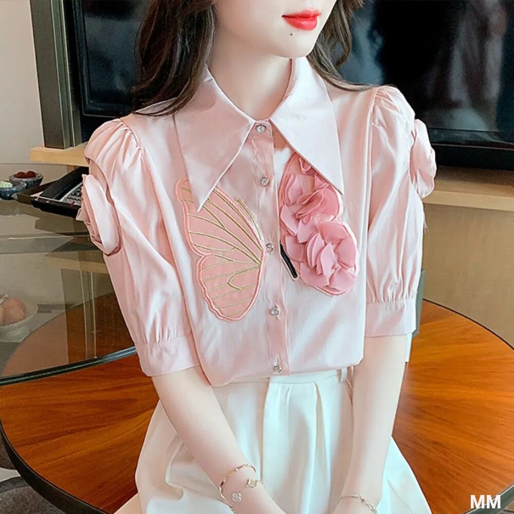 女性用3Dフラワーブラウス,半袖バブルスリーブ,女性用シフォンシャツ,愛らしいピンクのスリムトップス,女性のトレンド,夏のファッション,新しいコレクション2024 Tシャツ シャツ T240619142214_01