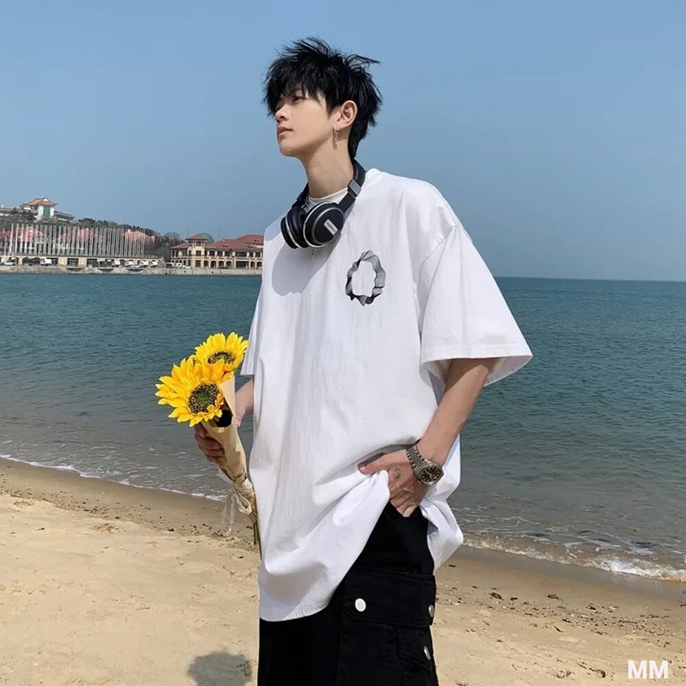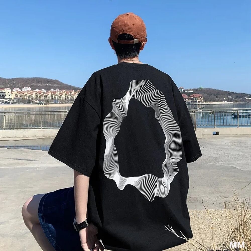 半袖の抽象的なプリントラインを備えたコットンTシャツ,原宿のストリートウェア,ジム用の特大Tシャツ Tシャツ シャツ T240619133916_02