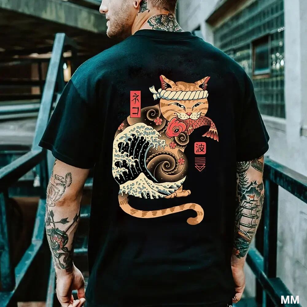 男性用サムライ猫柄Tシャツ,半袖Tシャツ,ラウンドネック,カジュアル,ルーズ,ヴィンテージ,アウトドア,ヒップホップスタイル Tシャツ シャツ T240619134017_05