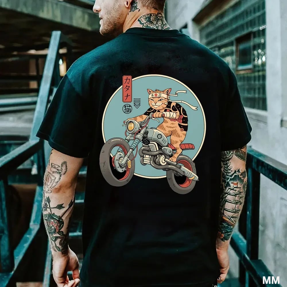 男性用サムライ猫柄Tシャツ,半袖Tシャツ,ラウンドネック,カジュアル,ルーズ,ヴィンテージ,アウトドア,ヒップホップスタイル Tシャツ シャツ T240619134017_07