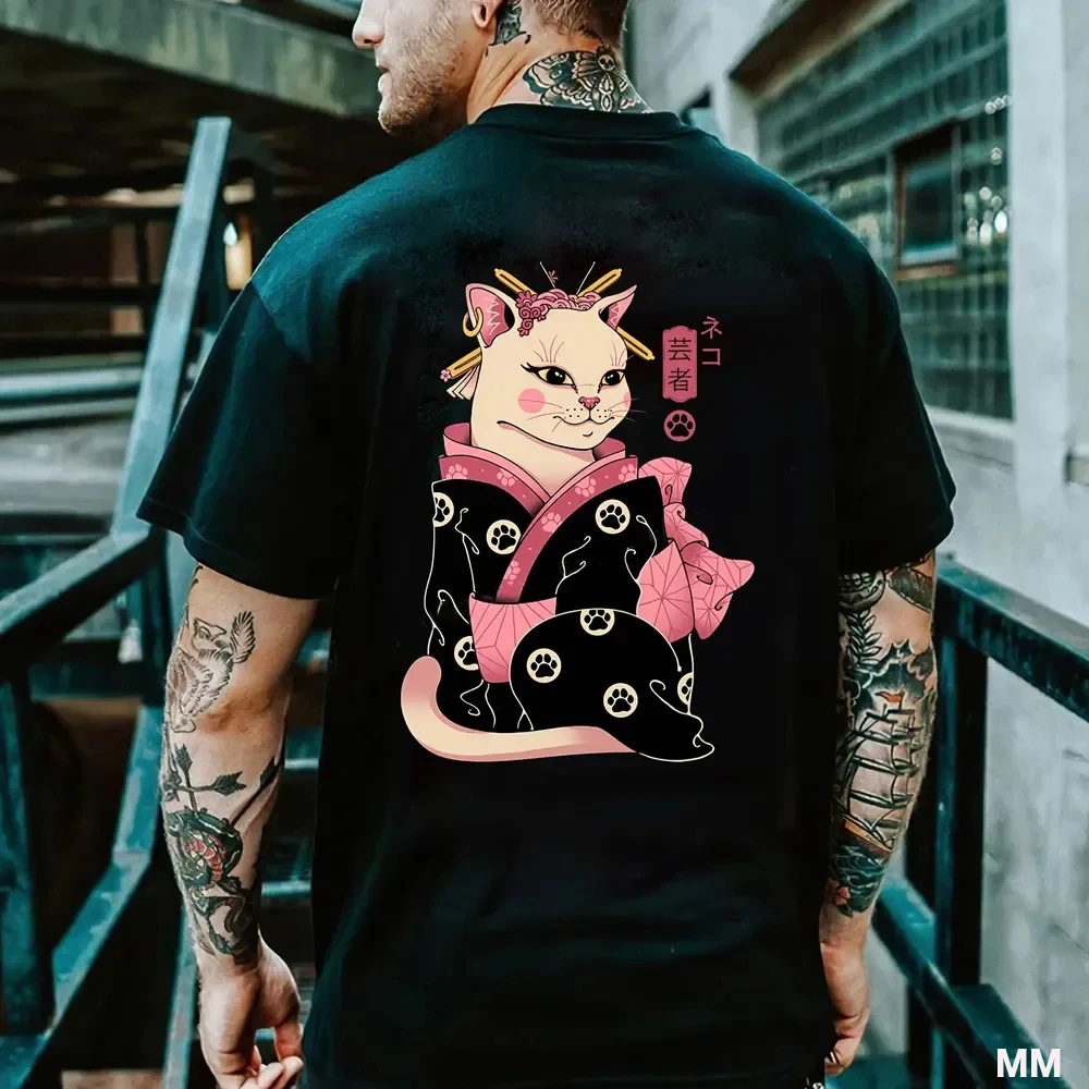 男性用サムライ猫柄Tシャツ,半袖Tシャツ,ラウンドネック,カジュアル,ルーズ,ヴィンテージ,アウトドア,ヒップホップスタイル Tシャツ シャツ T240619134017_14