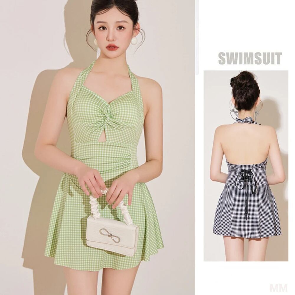 ワンピースレディースビキニセット,アクセント付きワンピース水着,カワイイスタイル,市松模様のスカート,ビーチウェア,夏,2023 韓国系水着 セパレート水着 ワンピース水着 T240626154459_02
