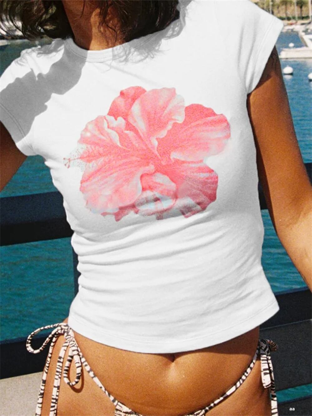 クロックスタイル 女性用フローラルプリントスリムTシャツ,半袖サマートップ,ラウンドネック,へそ,ストリートウェア ボトム ボトムス ズボン T240619170626_04