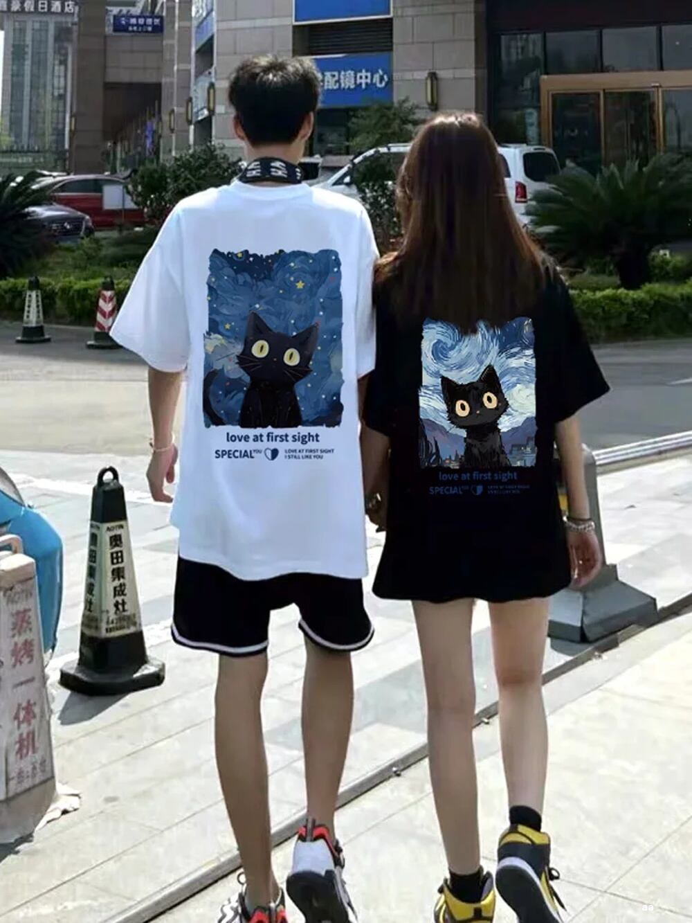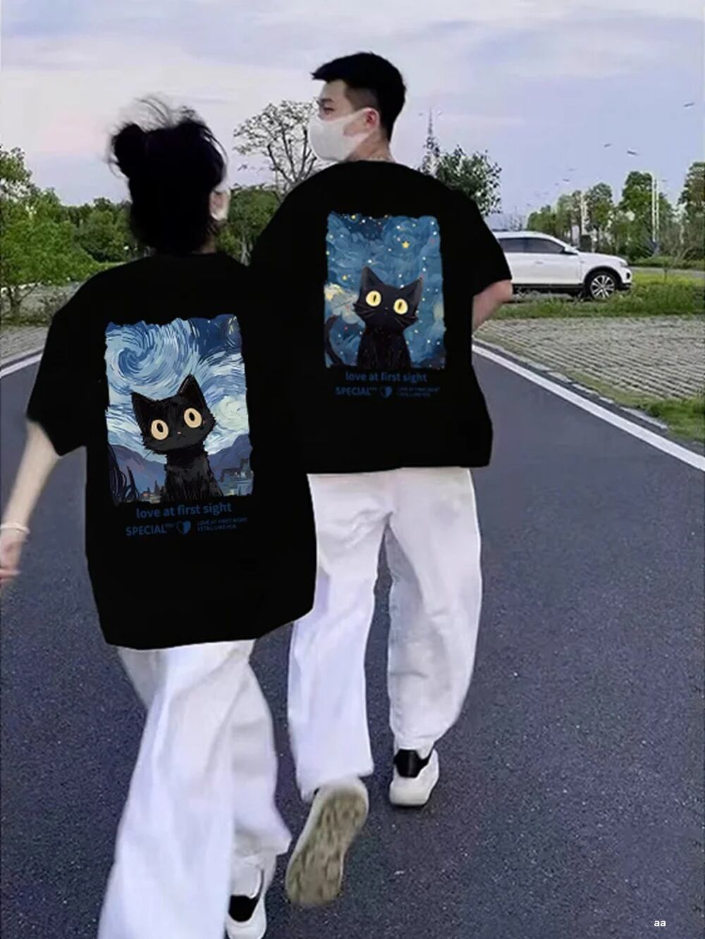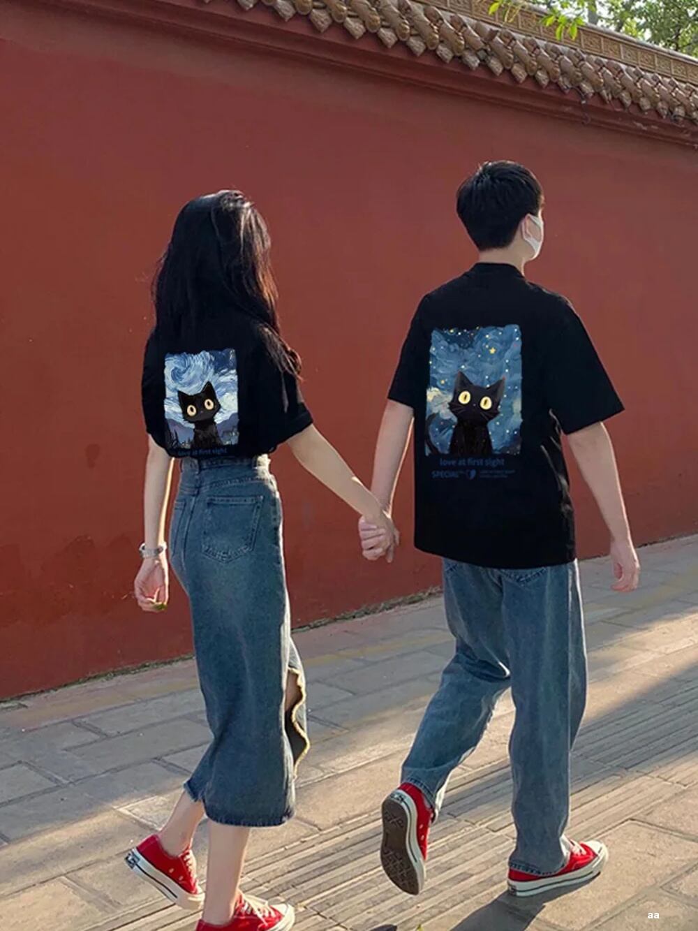男性と女性のための青い空の猫のプリントTシャツ,半袖のルーズなコットントップ,ボーイフレンドとガールフレンドのためのTシャツ ボトム ボトムス ズボン T240619170633_02