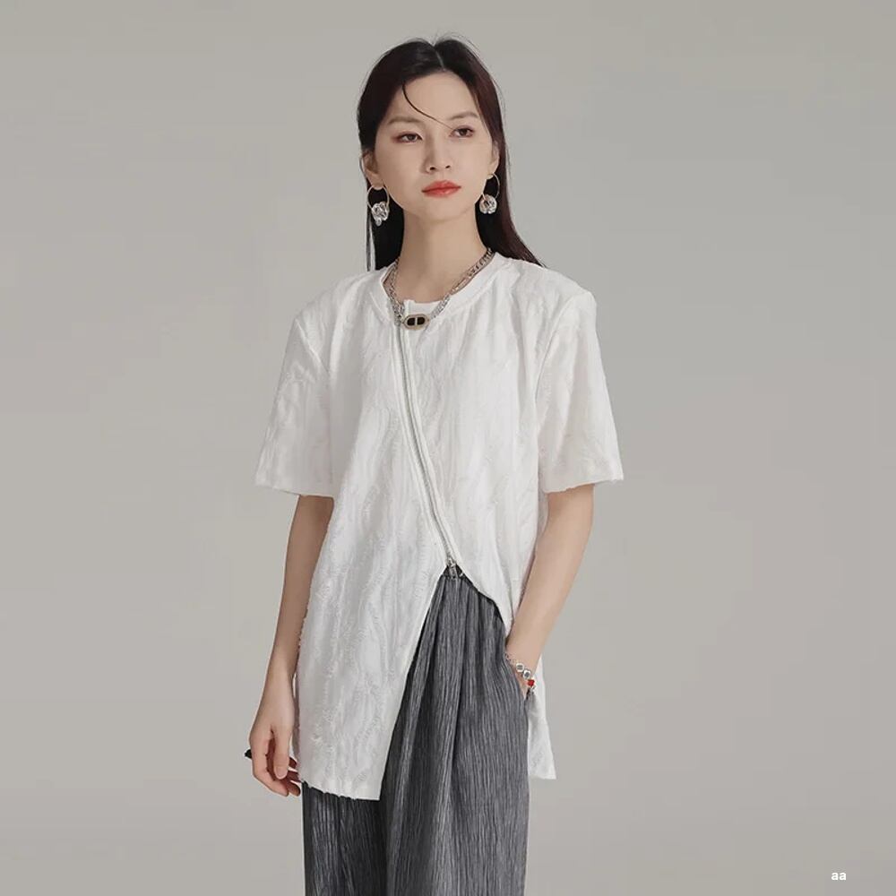 女性用半袖Tシャツ,ゆったりとしたトップス,不規則なジッパー,分割可能なウェーブテクスチャ,夏のファッション ボトム ボトムス ズボン T240619170808_02