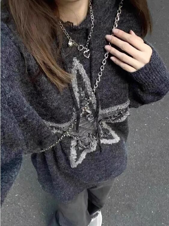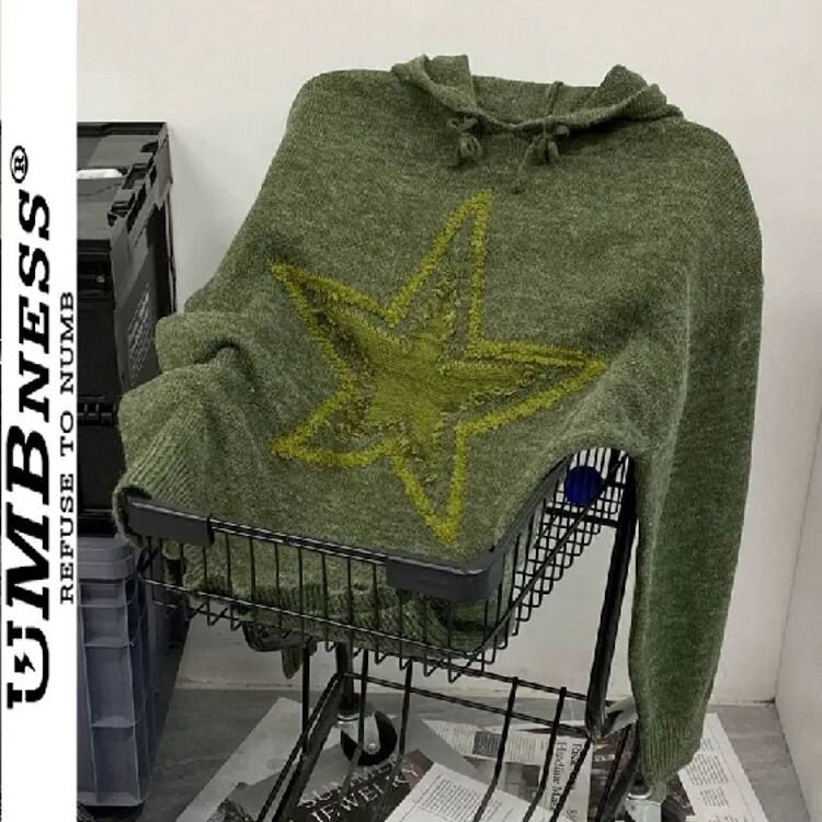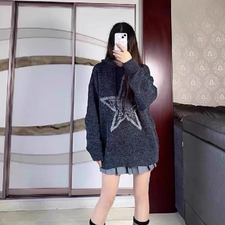 スター刺embroideryカップルセーター、ハイストリートフード付きナイトウェア、韓国トレンドスタイル、ニットパーカー、ヒップホップストリートウェア、yk2ファッション、秋