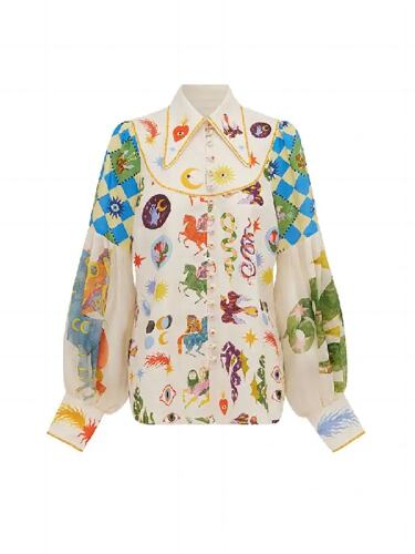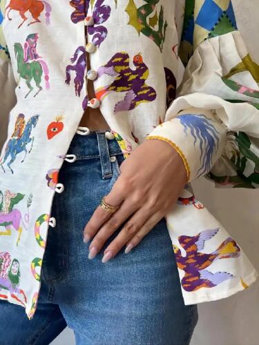 女性のカジュアルなプリントブラウス,フラップカラー,ランタンスリーブ,シングルブレスト,ルーズフィット,春と夏,2024