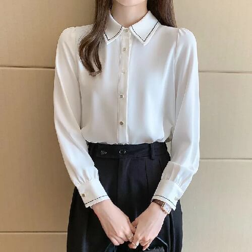 女性用長袖シャツ,襟を折りたたんだカジュアルなスタイルのブラウス,単色,春秋,df4959