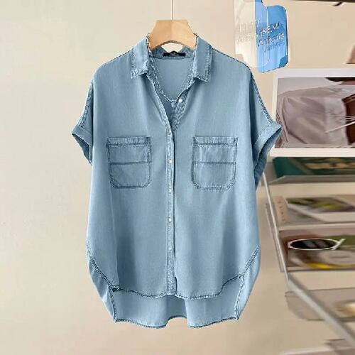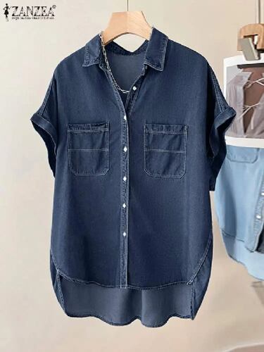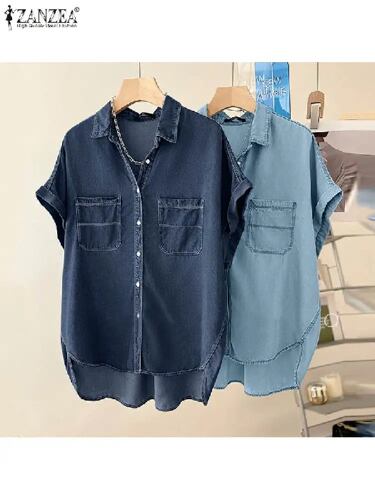 Zanzea-女性用の青いブラウス,半袖トップス,カジュアル,十分な無地,ボタンアップ,ラペル,特大,夏,2024