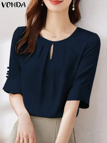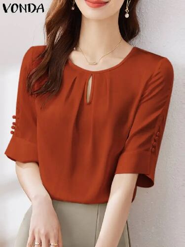 Vonda-レディースカジュアル半袖シャツ,無地,エレガント,チュニック,透かし彫り,セクシー,夏,2022