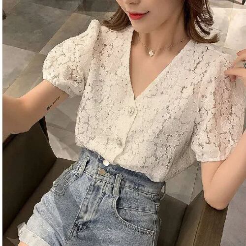 女性用半袖レースシャツ,ファッショナブルなフランススタイル,用途の広い花柄のブラウス,透かし彫り,2020