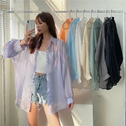 Xpqbb-女性用の透明なシフォンシャツ,日焼け止めのブラウス,シンプルでしっかりした,日焼け止め,ベーシックレディシャツ,サマー,韓国語