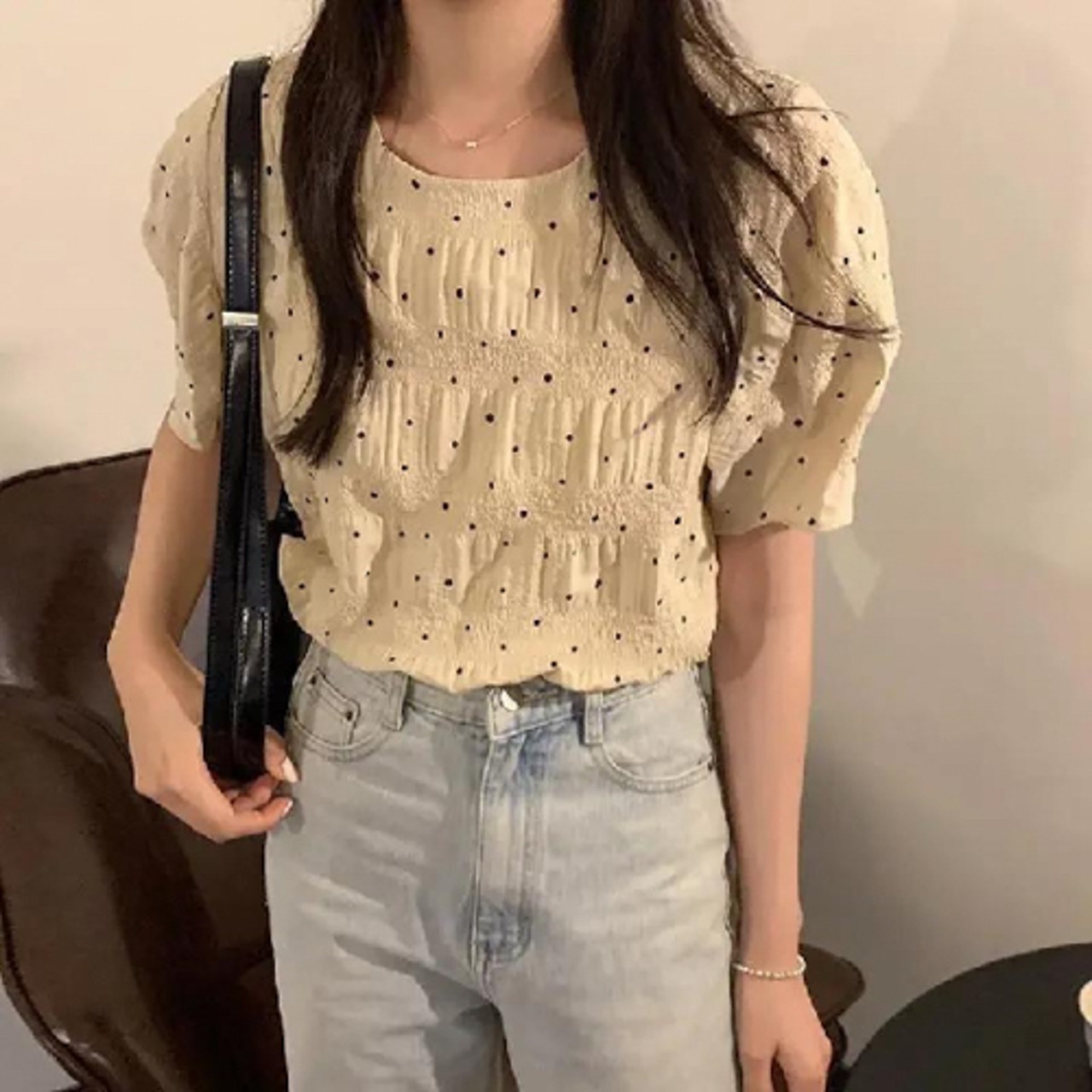 女性用半袖水玉シャツ,ラウンドネックとフリルのルーズフィットシャツ,ヴィンテージスタイル,サマースタイル,2023