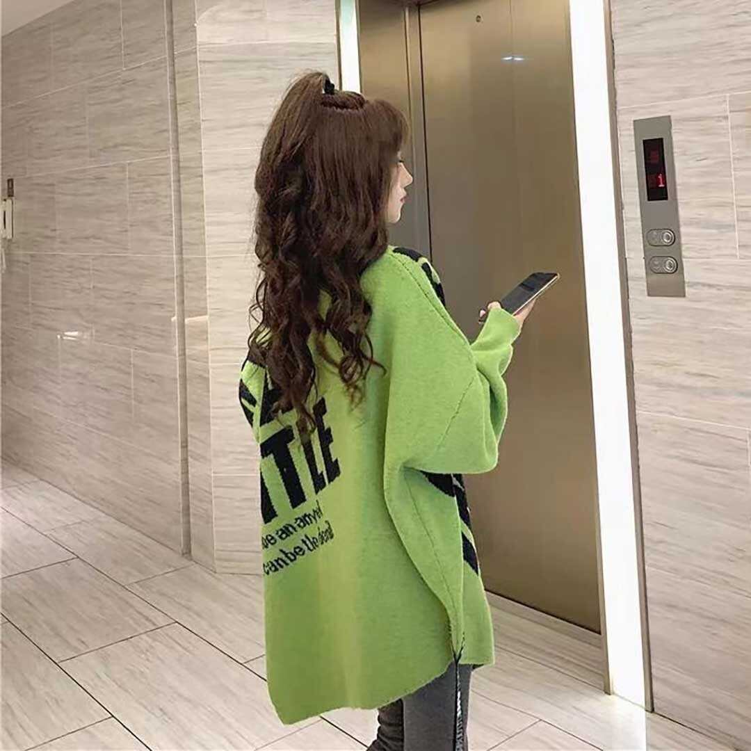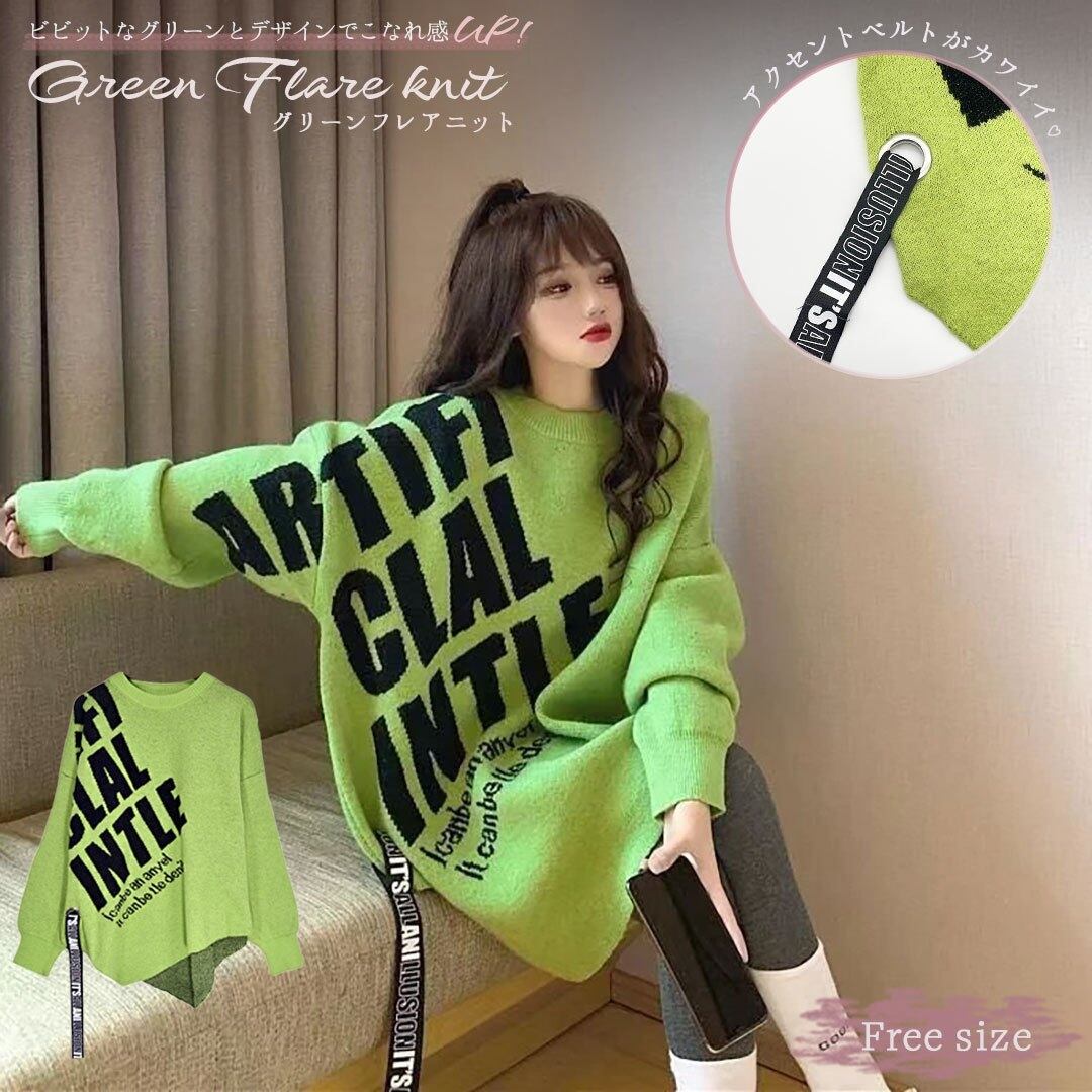 【在庫限り】 ニット セーター グリーン フレア 英語 トップス 韓国ファッション 長袖