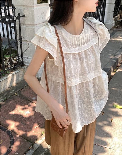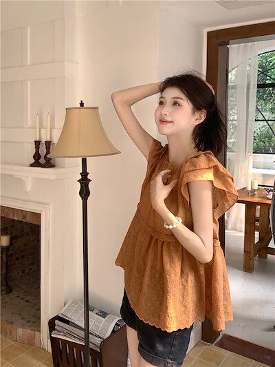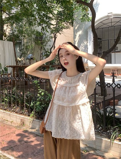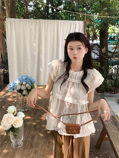 2024春夏トップス シャツ 半袖 ラウンドネック レース ゆったり フリル 夏 白 茶色 かわいい ガーリー おしゃれ 韓国ファッション レディース お出かけ