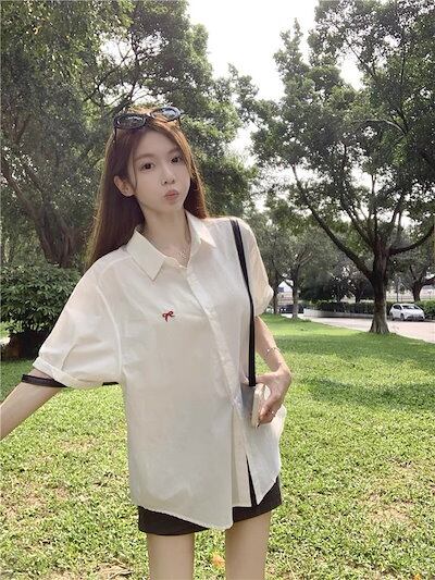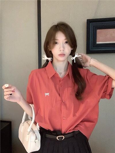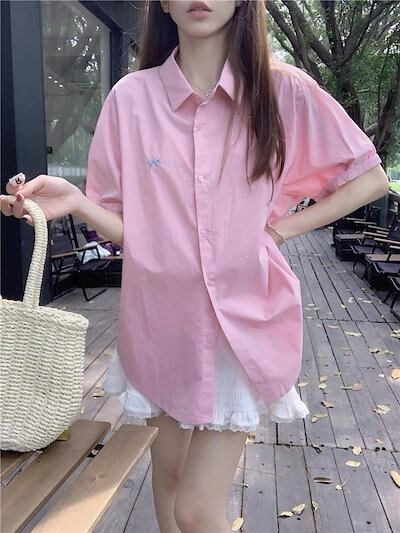 2024春夏トップス シャツ ボタン スタンダードカラー 刺繍 夏 黄色 緑 かわいい キュート おしゃれ 韓国ファッション レディース お出かけ