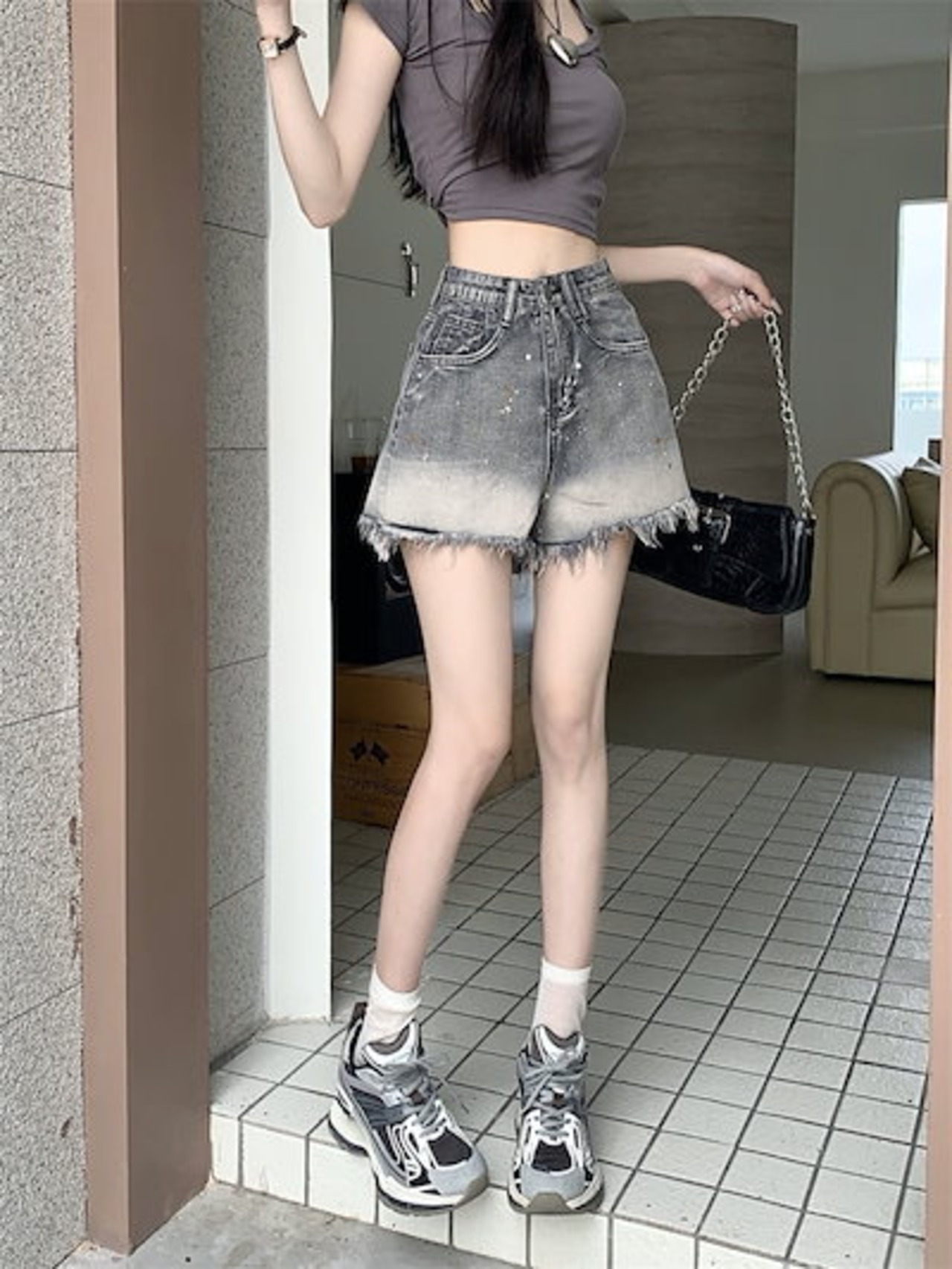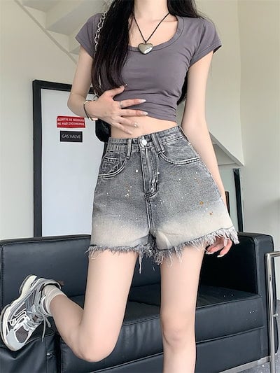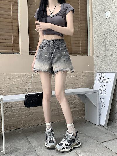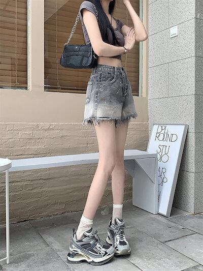 2024 春夏パンツ ショート丈 デニム ジーンズ ワイド グラデーション ウォッシュ加工 フリンジ ハイウエスト 脚長効果 美脚効果 細見え 夏 カジュアル おしゃれ かわいい 韓国ファッション レ