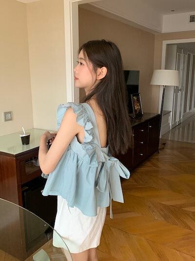 2024春夏トップス シャツ スクエアネック バック バックオープン フレア 夏 白 水色 かわいい ガーリー キュート おしゃれ 韓国ファッション レディース お出かけ