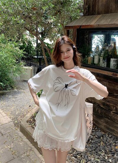 2024春夏トップス Tシャツ 半袖 ラウンドネック ゆったり 大きめサイズ 夏 白 シンプル かわいい ガーリー おしゃれ 韓国ファッション レディース お出かけ