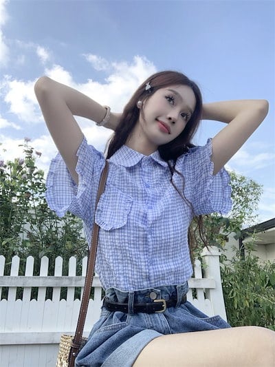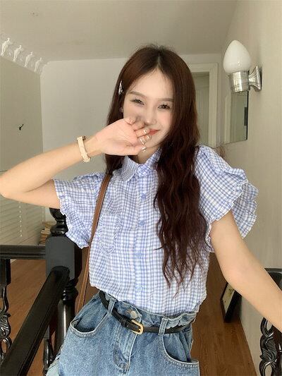 2024 春夏トップス シャツ 半袖 ボタン 襟 スタンドカラー ゆったり ギンガムチェック柄 夏 青 かわいい おしゃれ ガーリー 甘め カジュアル 韓国ファッション レディース お出かけ
