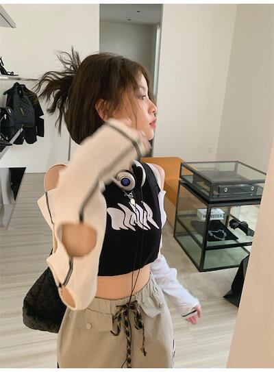 2024春夏 トップス 長袖 可愛い おしゃれ タイトフィット ショート T 重ね着丈 肌見せ フレンチ 女っぽ Tファッション フェミニン袖きれいめ 色っぽ プリントレイヤード韓国 レディース