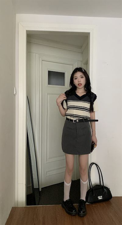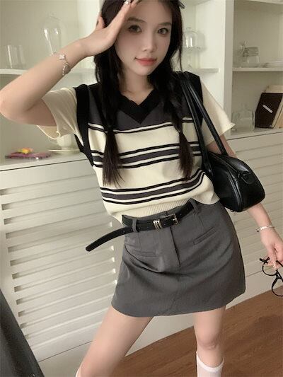 2024 春夏 セットアップ ショート丈 トップス ベスト スカートの2点セット アカデミズム学生 レディースニット 2点セットスカート 高校生 制服