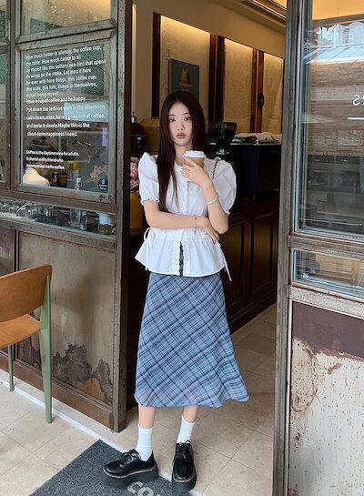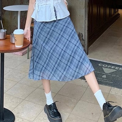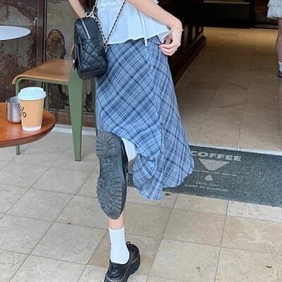 2024 春夏スカート 膝丈 Aライン レトロ チェック柄 ハイウエスト 美脚効果 脚長効果 細見え 夏 青 ブルー 韓国ファッション レディース かわいい おしゃれ きれいめ 大人っぽい カジュアル