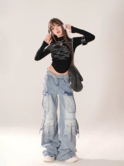 ダメージデニムパンツ Y2K ワイドパンツ vibe ポケット ワイドパンツ 着痩せ ワイドパンツ★11