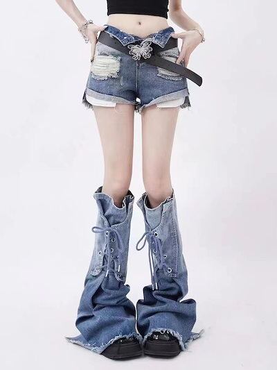 ダメージデニムパンツ Y2K ワイドパンツ レトロ ジーンズ ショートパンツ あしの長いカバー★14