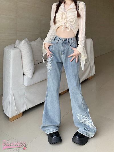 ハイウエスト フリンジ デニムパンツ ボトムス レッグ ゆるダボ ジーンズ ゆったり カジュアル ストリート 切りっぱなしカットオフ 加工 肌見せ ジーパン ファッション 秋 冬 春 スタイルアップ