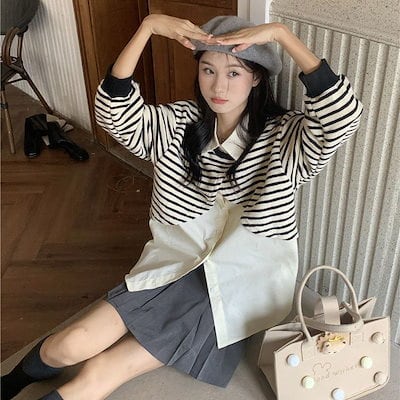 シフォンブラウス シアーシャツ 秋 Tシャツ 秋 ボーダー柄フェイクレイヤード シャツ レディース 長袖 トップス ブラウス 韓国ファッション 百掛け