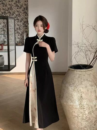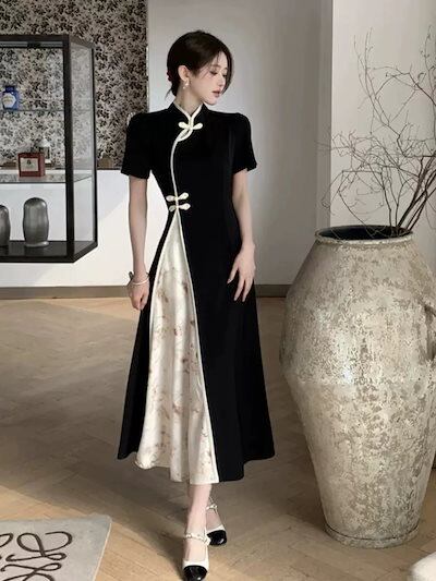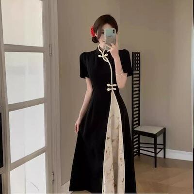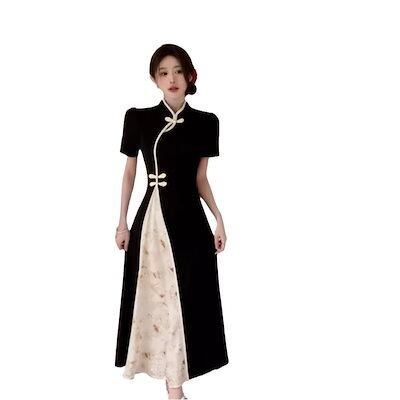 人气新作パーティードレス ドレス ワンピース 韓国ファッションレスロングワンピース 着痩 大きいサイズ新しい改良されたチョンサムドレス女性夏レトロ半袖ドレープロングスカートメガ割