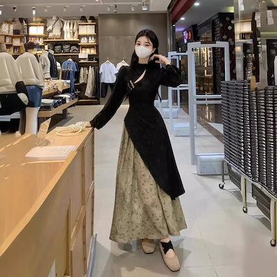 人气新作パーティードレス ドレス ワンピース 韓国ファッション レスロングワンピース 着痩新しい中空改良チョンサムジャカードスプライシング色の衝突ドレス長袖ヘムラインロングスカートメガ割