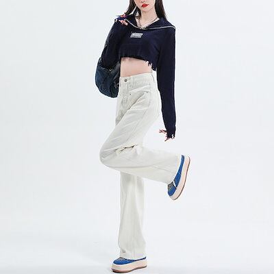 激?れ人気商品 脚長効果!デニムパンツ かっこいい!スラックスパンツ ストレートジーンズジーンズ百掛け 春夏 ハイウエスト ホワイト ゆったり ワイドパンツ