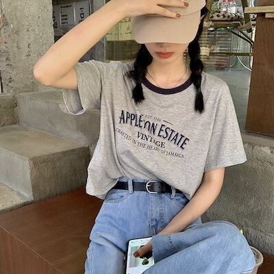 Tシャツ レディース アメリカンクルーネック半袖カジュアルクラッシュカラー夏のアルファベットゆったりショート丈レトロ トップス 韓国ファッション