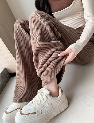 無地 コーデュロイパンツ ハイウエスト ストレートパンツ プリーツ ポケット ルーズ ロングパンツ ワイドパンツ ゆったりパンツ 韓国ファッションスキニーパンツ 脚長効果!