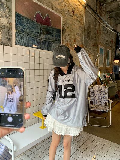 2024 秋冬 トップス 長袖 かわいいラウンドネック Tシャツ レディース 韓国風 12ロゴ衣装ルーズ ゆったりカジュアルおしゃれサイズスリーブシルエットファッション系サイドシャツフットスウエット春
