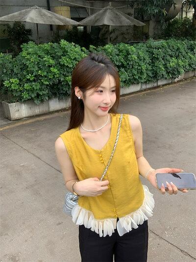 2024 春夏トップス シャツ ノースリーブ ボタン ラウンドネック フリル ゆったり 細見え 夏 黄色 イエロー おしゃれ かわいい 韓国ファッション レディース お出かけ