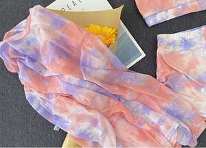 2色 タンキニ 水着 レディース 3点セット Tシャツ ラッシュガード カジュアル タイダイ シャーリング スポーティー 体型カバー 水着 セパレート 上下セット ビキニ ショートパンツ ピンク グリ