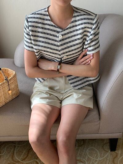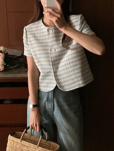 2024秋冬アウター ジャケット ラウンドネック ボーダー 半袖 ボタン 秋 黒 青 水色 ライトブルー おしゃれ かわいい 韓国ファッション レディース お出かけ