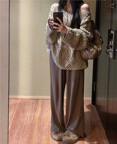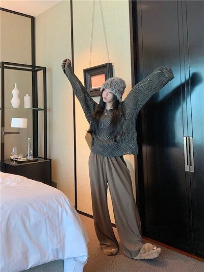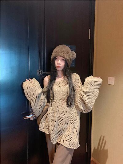 2024秋冬トップス ニット 透かし彫り 長袖 オフショルダー ゆったり 細見え 秋 茶色 おしゃれ かわいい ガーリー キュート 韓国ファッション レディース お出かけ