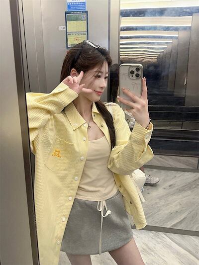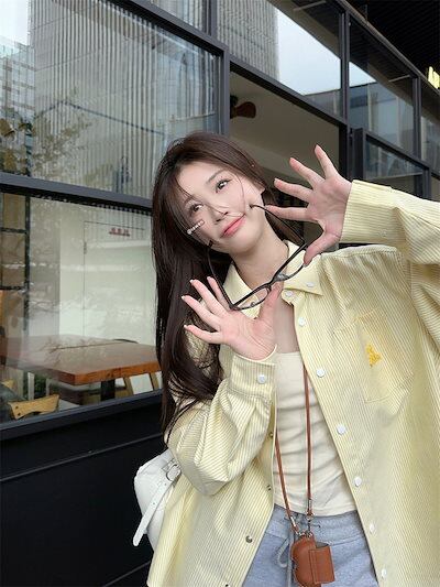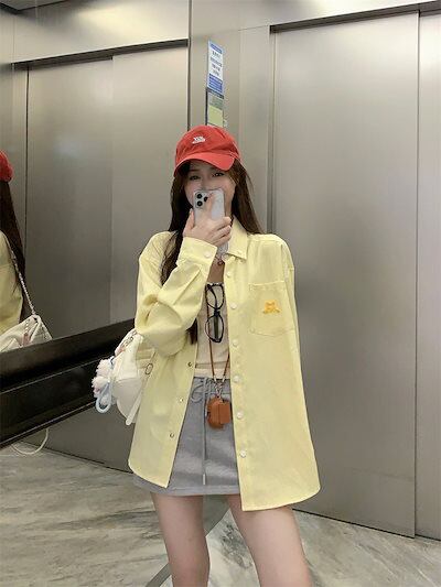 2024秋冬トップス シャツ 長袖 ストライプ ボタン 襟 ゆったり 秋 黄色 イエロー おしゃれ かわいい 韓国ファッション レディース お出かけ