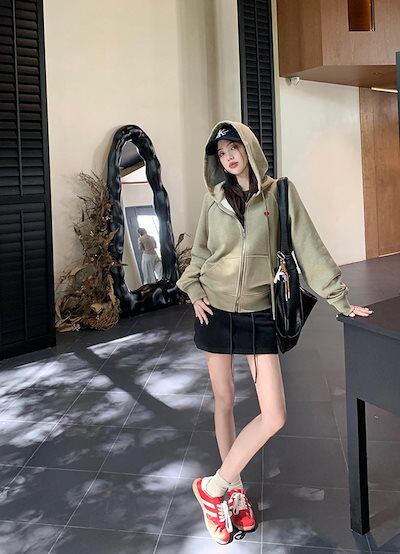 2024 秋冬アウター パーカー フード付き ジップ チャック 長袖 花柄 ポケット ハート 細見え 秋 緑 カーキ おしゃれ かわいい ガーリー キュート 甘め 韓国ファッション レディース お出か